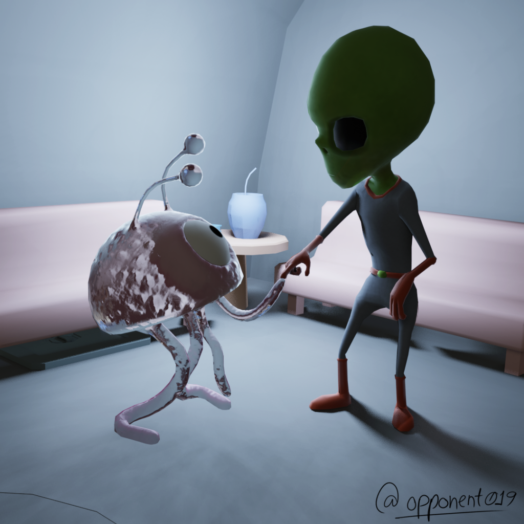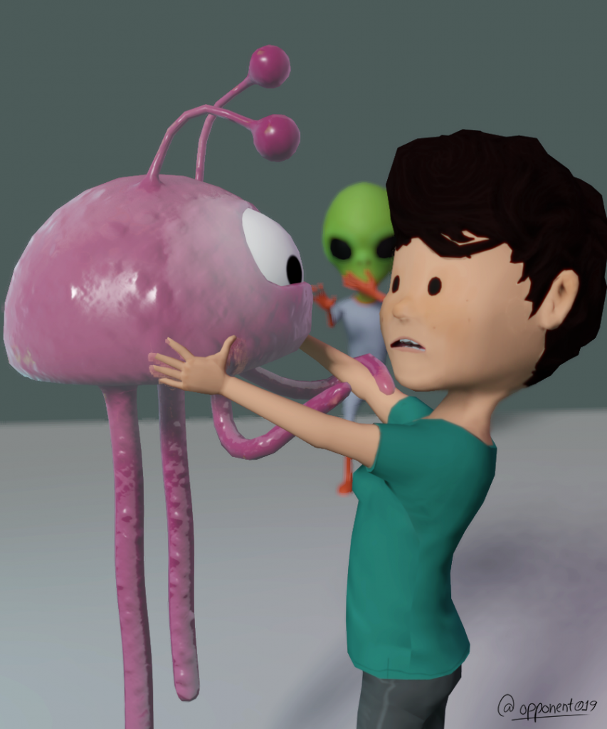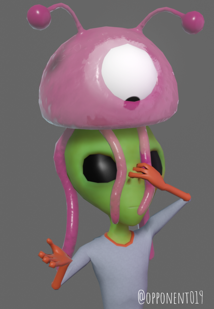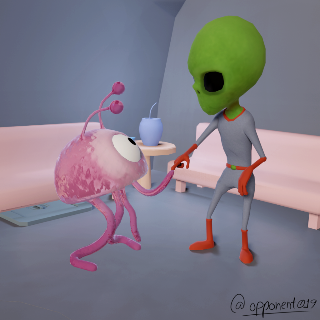 Project made with Blender 2.8 in 2019, rendered using Eevee with some editing in Photoshop. Used the render above to practice volumetric lighting and really liked the result. And with the pink alien I got a lot into mixing shaders to accomplish this jelly-like material.